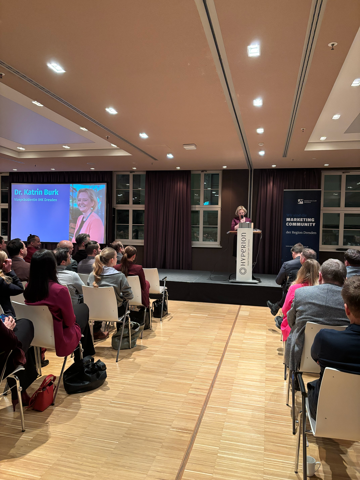 Ein inhaltlicher Höhepunkt war der Impulsvortrag von Frau Dr. Katrin Burk, Vizepräsidentin der IHK Dresden. Sie sprach offen über die aktuellen wirtschaftlichen Herausforderungen, machte aber zugleich Mut, neue Ideen zu entwickeln und Veränderungen aktiv mitzugestalten. Die zentrale Botschaft des Abends: Marketing ist mehr als Kommunikation, es ist ein strategischer Erfolgsfaktor in Zeiten des Wandels.